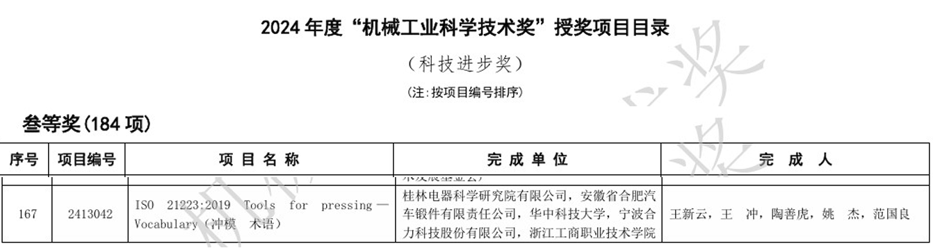 10月22日,中國(guó)機(jī)械工業(yè)聯(lián)合會(huì)和中國(guó)機(jī)械工程學(xué)會(huì)聯(lián)合發(fā)文,通報(bào)表彰了2024年度“機(jī)械工業(yè)科學(xué)技術(shù)獎(jiǎng)”的獲獎(jiǎng)項(xiàng)目。桂林電科院主導(dǎo)制定的國(guó)際標(biāo)準(zhǔn)ISO 21223:2019 Tools for pressing—Vocabulary(沖模 術(shù)語(yǔ))榮獲科技進(jìn)步獎(jiǎng)三等獎(jiǎng)。
